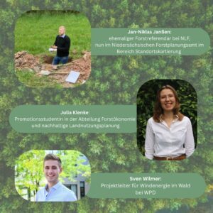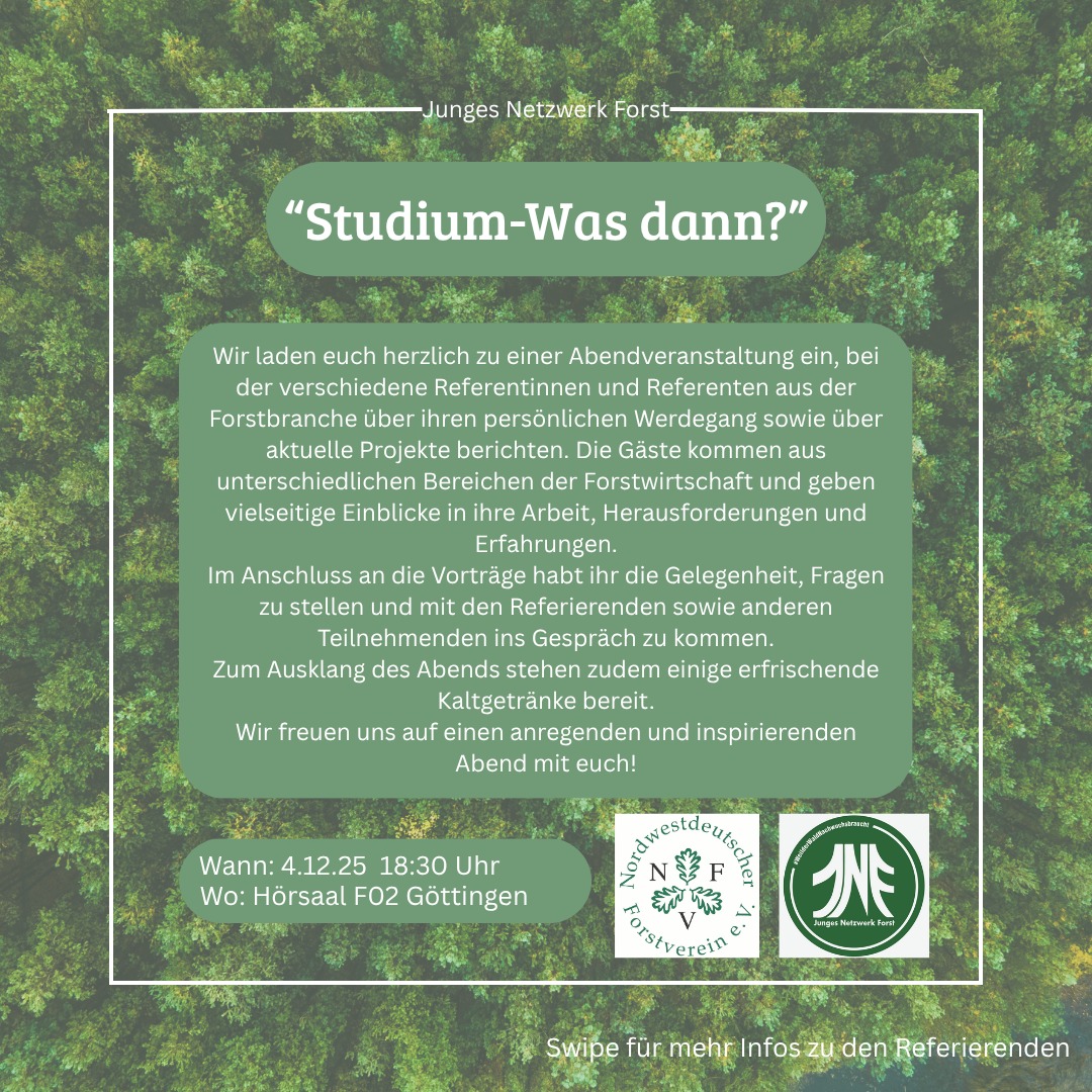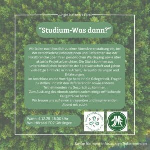 Die Veranstaltung „Studium – was dann ?“ soll verschiedene Optionen nach dem universitären aber auch fachhochschulischen Studium aufzeigen. Julia Klenke (Promotionsstudentin bei Carola Paul) wird die Option einer Promotion aufzeigen und von ihrem bisherigen Werdegang berichten, Sven Wilmer wird als Projektierer bei WPD seinen Weg in die freie Wirtschaft vorstellen und Alina Kelka (Forstoberinspektorin) und Jan-Niklas Janßen (Assessor des Forstdienstes) werden zwei Weg in den Landesbetrieb erläutern und ihre Erfahrungen damit teilen.